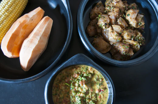 Forvarm ovnen til 200 grader og sæt skrællede og aluminiumspapir indpakkede søde kartofler og majskolbe ind i ovnen og lad stege en time eller til kartoflerne er møre.