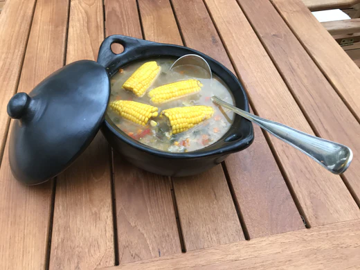 Suppen her er baseret på 3 slags kød samt 2 slags kartofler og majs.