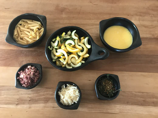 Bacon steges på en stor dyb pande indtil det er gyldent. Derefter tilføres de udskårne squash, som steges til de er blevet lidt bløde og gyldne. Tilsæt timian og et ordentligt drys peber.