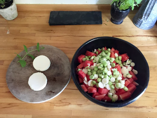 Vandmelon, ost og mynte lægges i et stort fad og limesaften hældes over. Der dryppes olivenolie hen over.